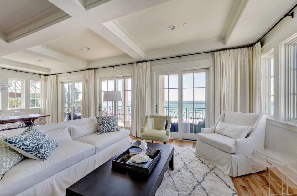 В этом стиле чаще всего применяют белые или синие занавески с рисунками, геометрическими принтами или без. Также отдельного внимания заслуживают натуральные изделия из бамбука, которые отлично сочетаются с дизайном помещения и поддерживают общую стилистику.
