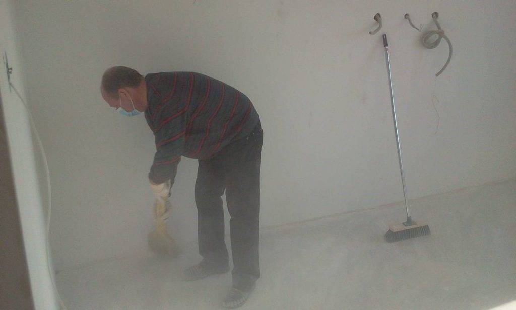 - После высыхания потолка, перед нанесением грунтовки и краски, нужно обеспылить и подмести поверхность.