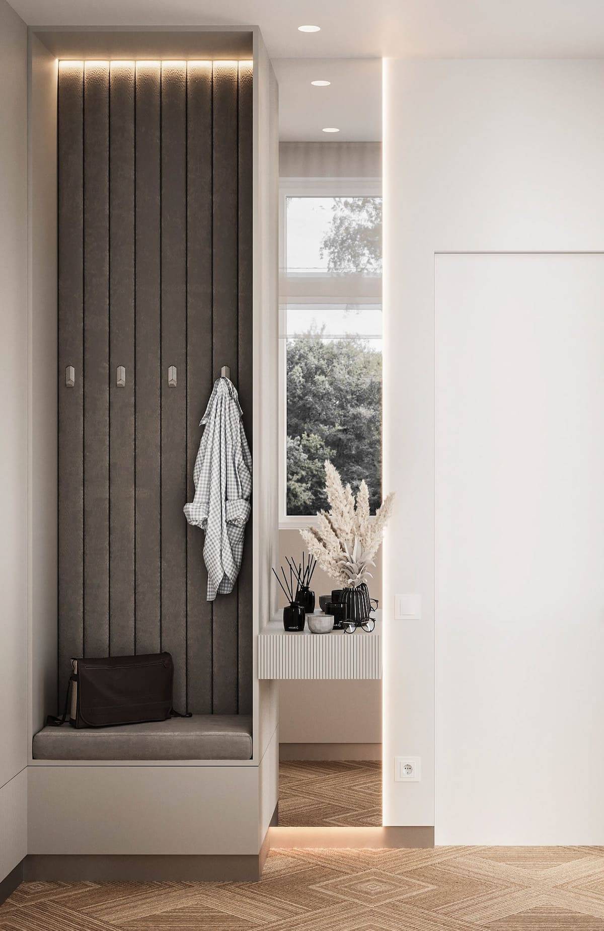 Отделка прихожей в светлых тонах не ограничивается белым. Его наиболее близкие альтернативы — бежевый и серый. Первый подойдет, если вы хотите создать максимально уютный коридор. Также беж — основа классики и неоклассики. Серый предпочтителен в скандинавском стиле, хай-теке, минимализме. Он вносит нотки прохлады в общую картину, успокаивает, расслабляет.