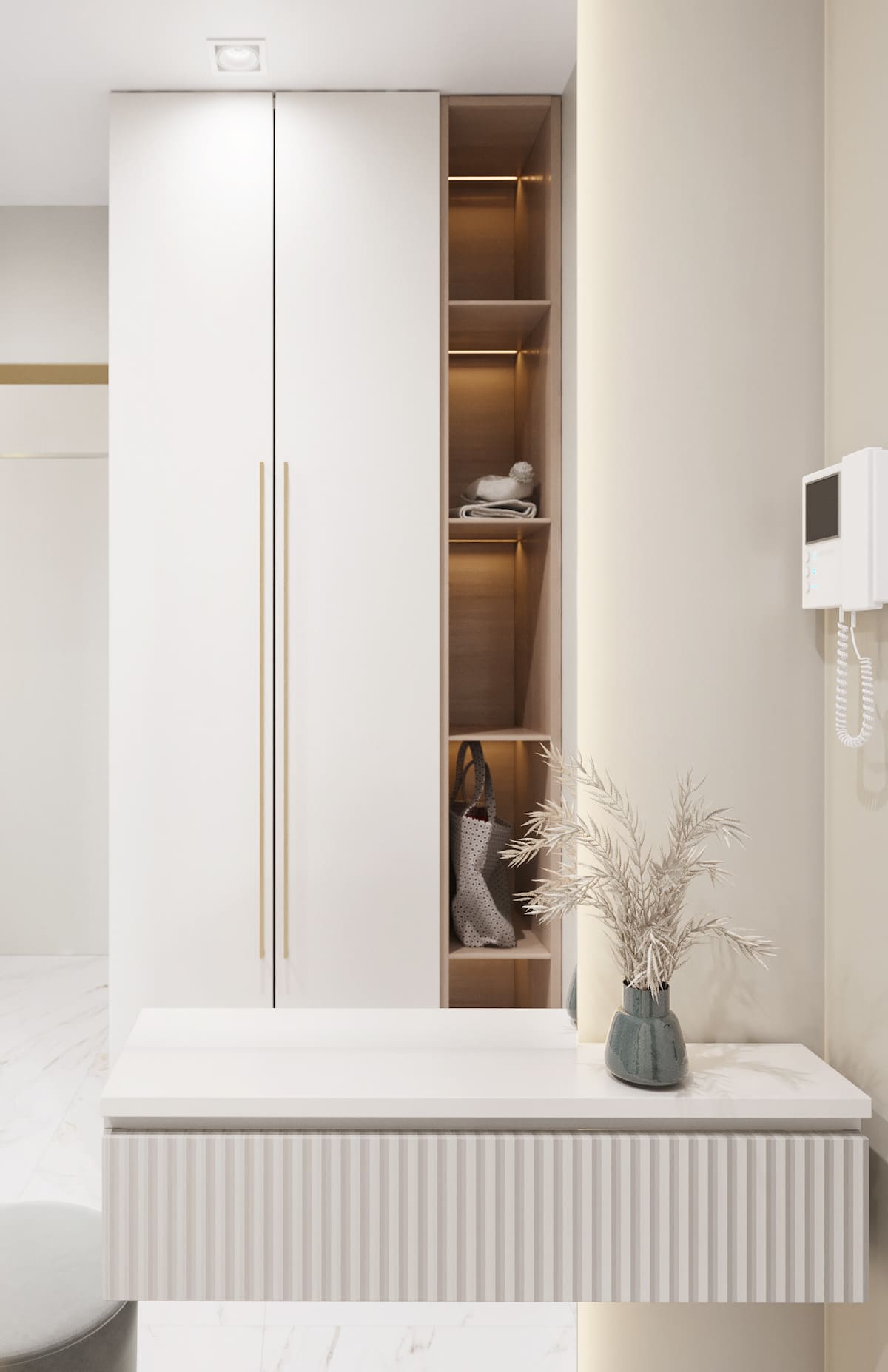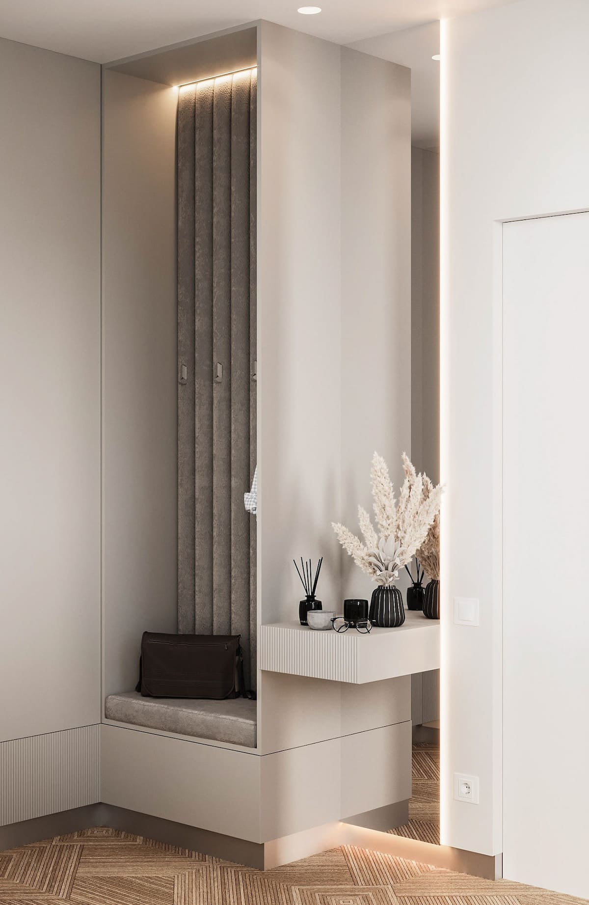 | 5. | Мебель | К встроенным шкафам добавьте вешалку и обувную полку, компактную банкетку или пару пуфиков. |
