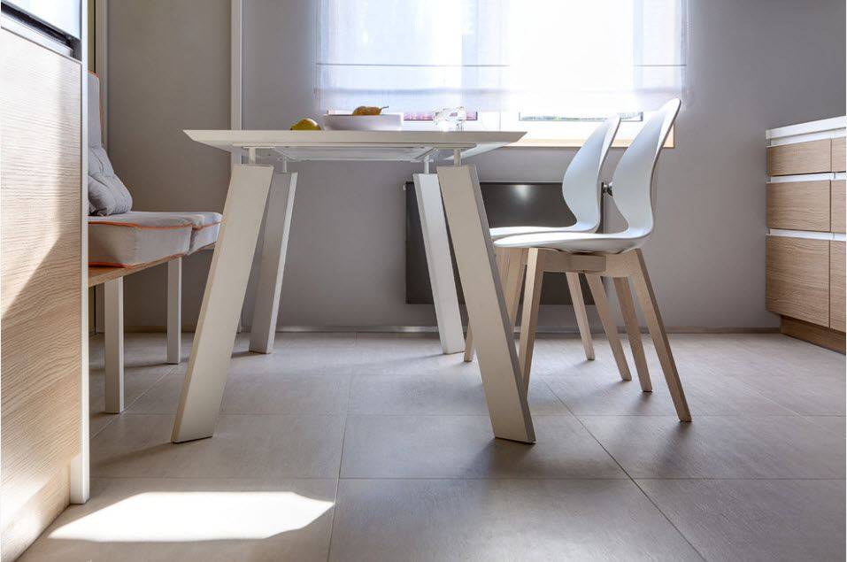Самый популярный и практичный материал, используемый для отделки пола — керамическая или керамогранитная плитка. Современные производители предлагают большой выбор данного вида отделки разной формы, размера, цвета и рисунка. Бюджетным вариантом является линолеум: однотонный или с имитацией природных материалов. Также можно использовать и комбинированный вариант: в рабочей зоне настилают плитку, а в обеденной — ламинированную доску. Честно говоря, такое сочетание не очень приветствуется большинством дизайнеров интерьеров.