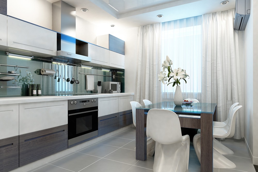 модерн, хай-тек и минимализм. Дизайн кухни 9 метров квадратных в этом стиле будет очень простым, с чистыми линиями мебели и минимумом декора. Бытовой техники здесь обычно переизбыток;