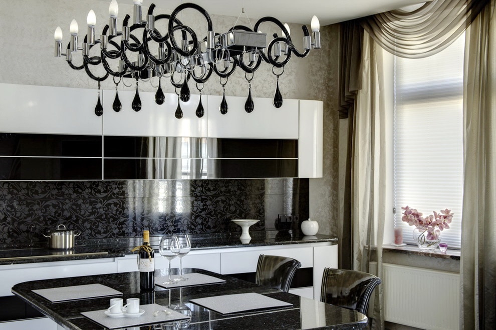 Люстра прекрасно справится с поставленной задачей, однако для большей комфортности нужно оформить дополнительную подсветку рабочей зоны и обеденного уголка. В первом случае потребуются локально светящие лампы, желательно с регулировкой направленности светового потока, во втором – импозантные бра с мягким, приглушенным, рассеянным светом.