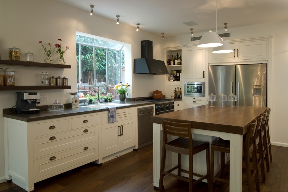 Если же в планах посудомоечной машины нет, то можно перенести мойку к окну. В этом случае уже придется заниматься удлинением труб, что достаточно непросто: придется поднимать их угол либо же покупать насос, который стоит недешево. Но зато такое действие освободит рабочее пространство, и при мытье посуды можно будет любоваться пейзажем за окном, а не просто смотреть в стенку.