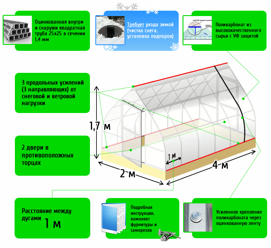 Основными техническими характеристиками парника из поликарбоната считается надежность и прочность сооружения, которое состоит из цельносварных дуг и торцевых модулей с двумя дверьми и двумя форточками. Между дугами расстояние равняется 63 см. Для повышенной нагрузки от снега две горизонтали из четырех смещаются кверху в виде капли. Крепление поликарбонатных материалов происходит саморезами, а детали каркаса крепятся болтами и гайками.