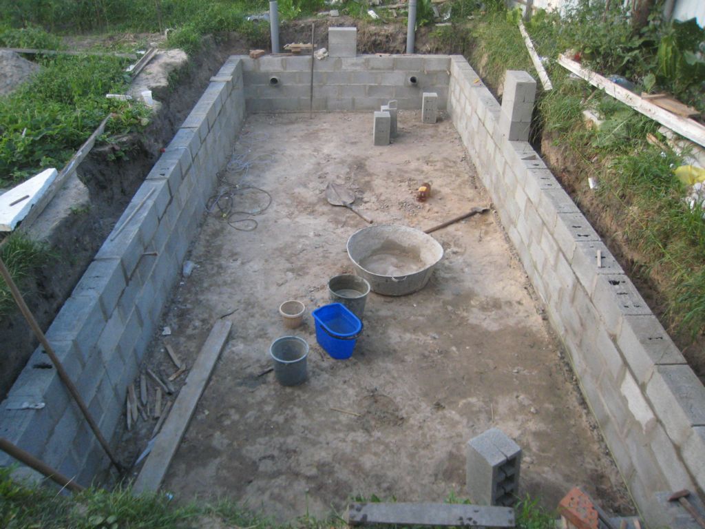 Заливается фундамент основания. Для этого периметр выкладывается блоками и заливается бетоном или цементным раствором.
