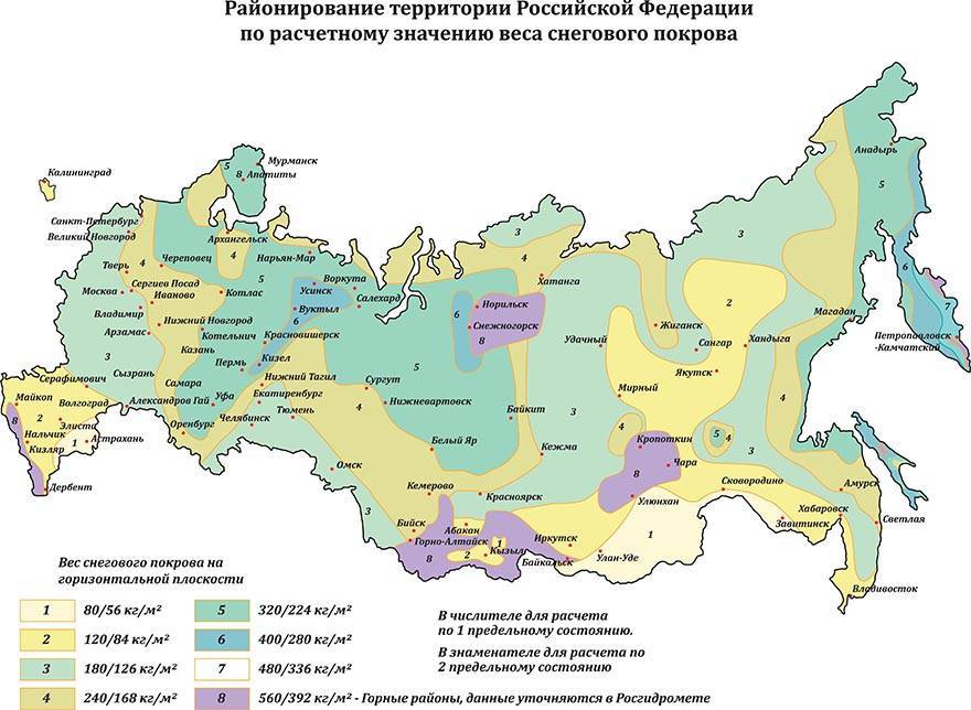 Всего на территории России имеется 8 снеговых районов. И если в первом предельная снеговая нагрузка равна 80 кг/м2, то в последних уровень снега может превышать отметку в 400 кг/м2.