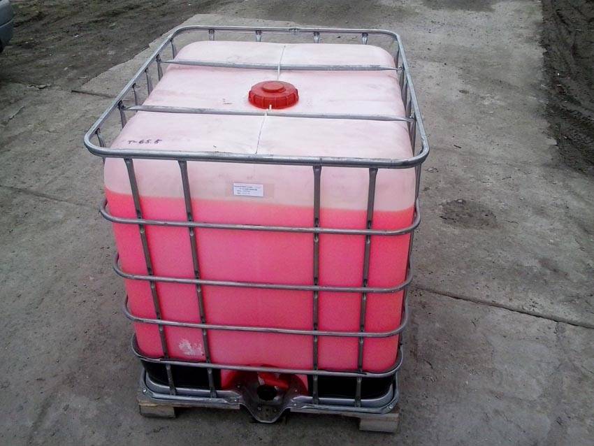 Емкостью для разведения может быть полиэтиленовая бочка или металлическая для пищевых продуктов. В нее заливают воду и после добавляют отмеренное количество антифриза. Перемешивать раствор не нужно иначе образуется пена, и раствор получит дополнительное насыщение кислородом.