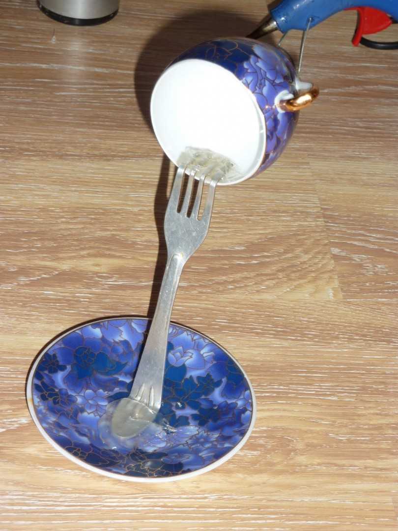 - Придайте вилке изогнутую форму и приклейте ручку вилки к внутренней стенки чашки клеевым пистолетом. Затем приклейте вилку к центру блюдца, оставьте на 10 минут, а потом сверху нанесите горячий клей. Изображение 15 и 16.