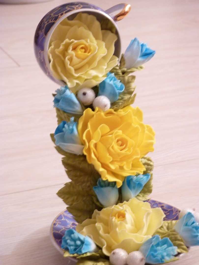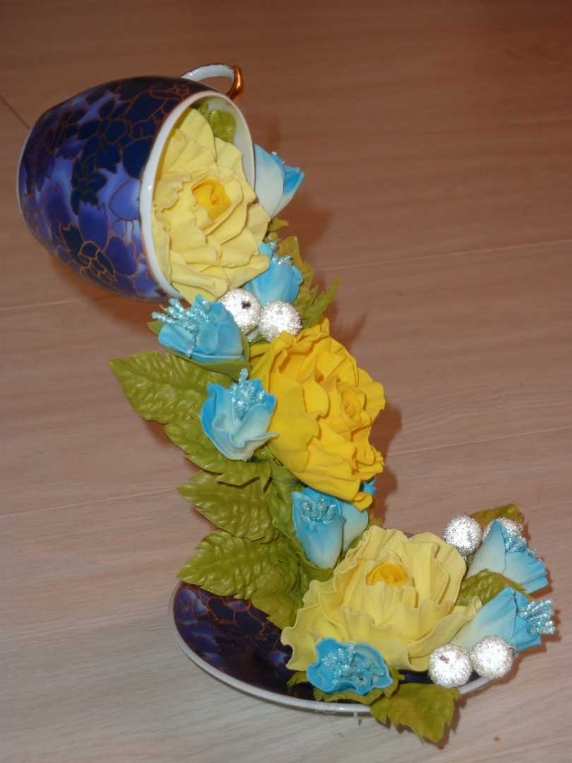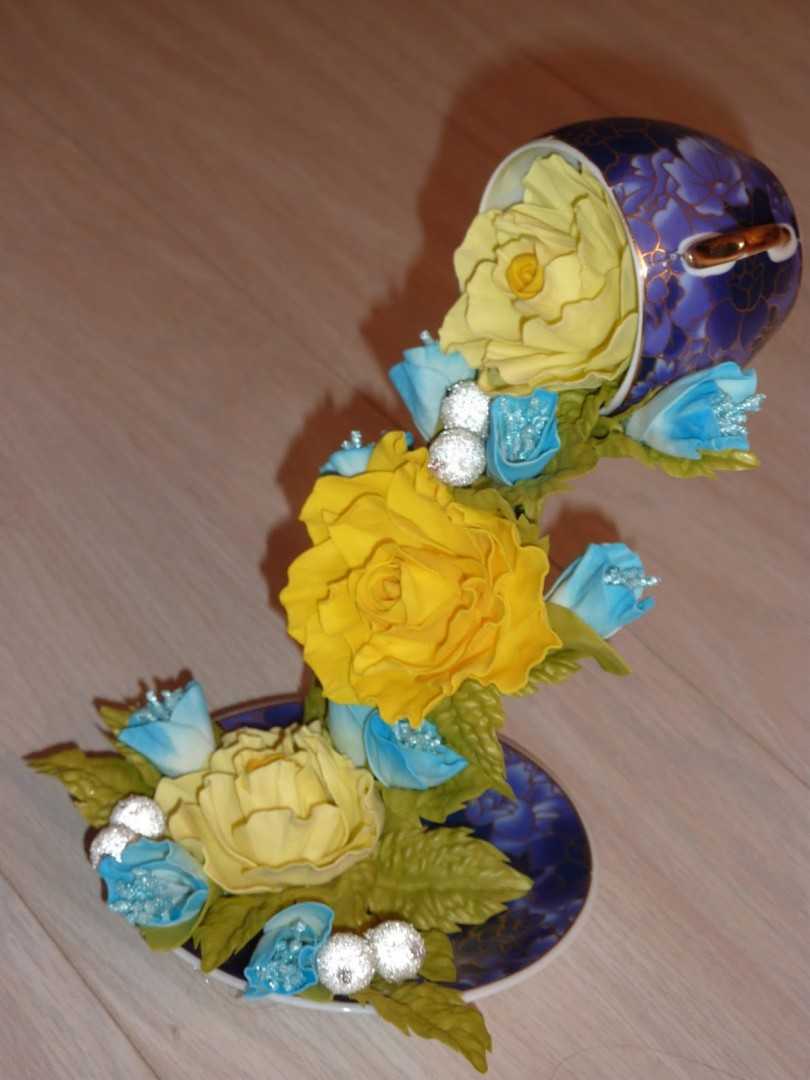 Такую же процедуру необходимо повторить и с чашкой. Здесь аккуратно размещаем все цветочки, желательно меньшего размера, и хорошо их закрепляем.