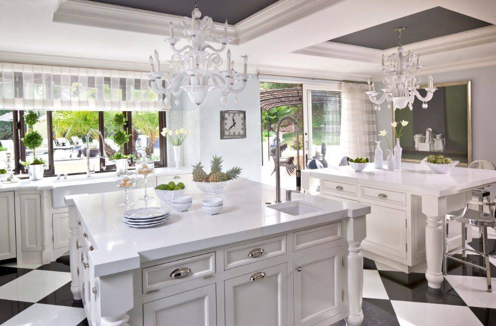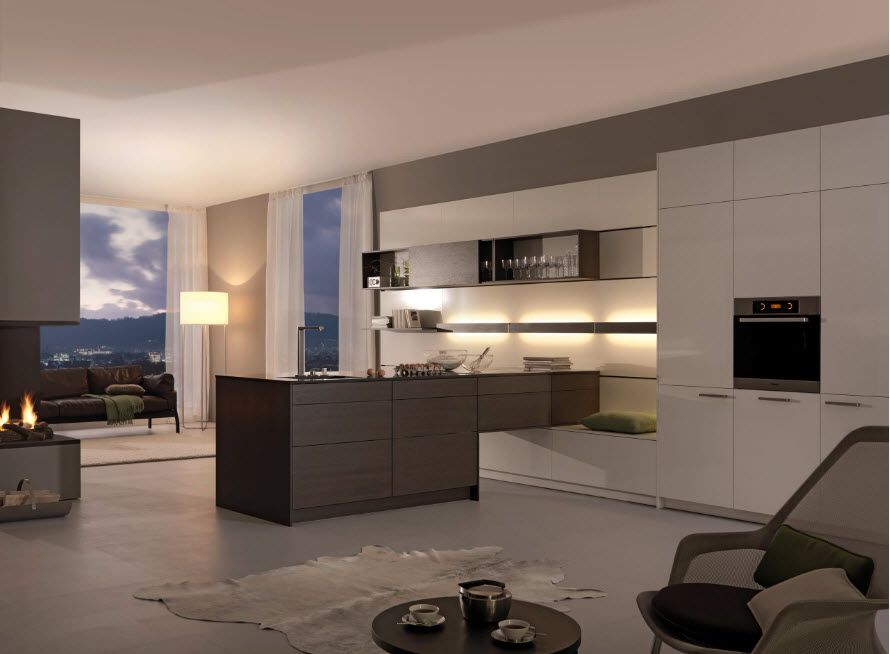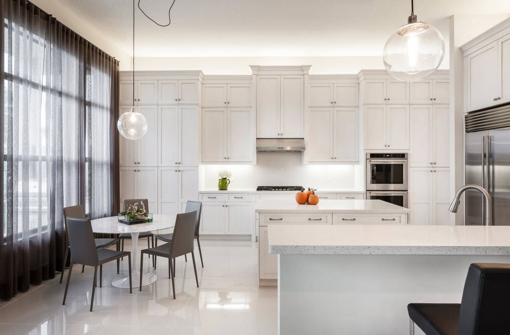 На фоне белоснежной отделки и светлых кухонных фасадов, темный текстиль будет выглядеть эффектно, привлекать внимание к большим окнам и визуально «вытягивать» помещение в высоту, если расположить карнизы под самым потолком