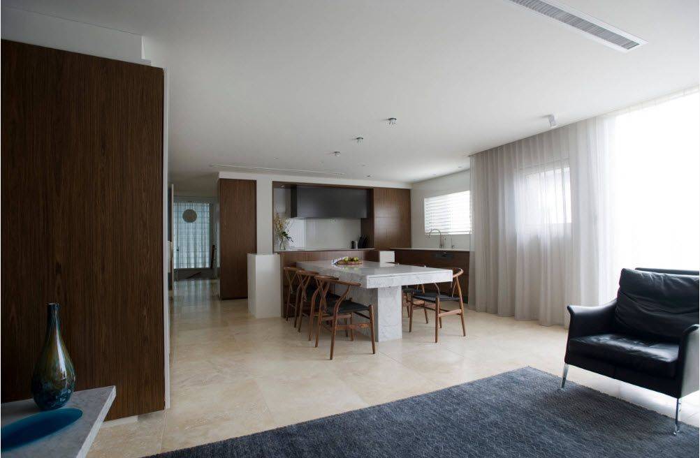 В просторном помещении, выполняющем функции гостиной, столовой и кухни, как правило, используется принцип открытой планировки. При таком подходе отделка всех функциональных сегмент чаще всего имеет идентичное исполнение. Еще одним объединяющим фактором для всех зон может стать драпировка нескольких окон единым выбором текстиля. Белоснежный гладкий тюль станет отличным выбором, органично выписывающимся в любой стиль оформления пространства.