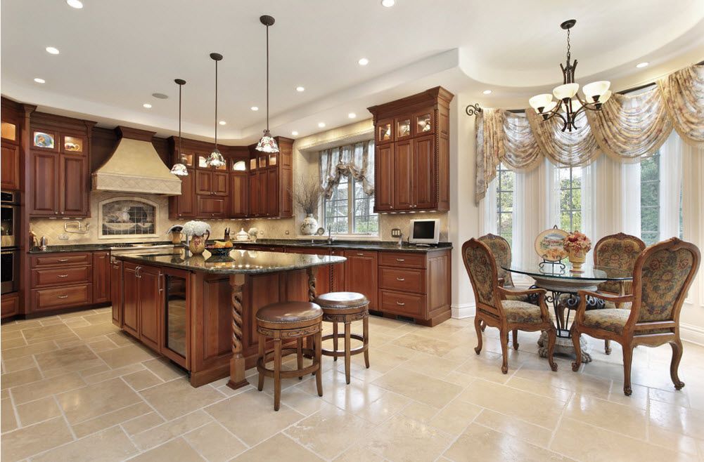 Шторы в пол — зачастую состоят из двух элементов. Как правило, они изготовлены из полупрозрачного или плотного материала, который не пропускает солнечные лучи. Вверху у карниза часто используют ламбрекен в качестве украшения. Такой тяжелый вариант подойдет для кухни, выполненной в стиле кантри, классика, прованс. Существенным плюсом является то, что можно комбинировать несколько материалов и получать оригинальные варианты.