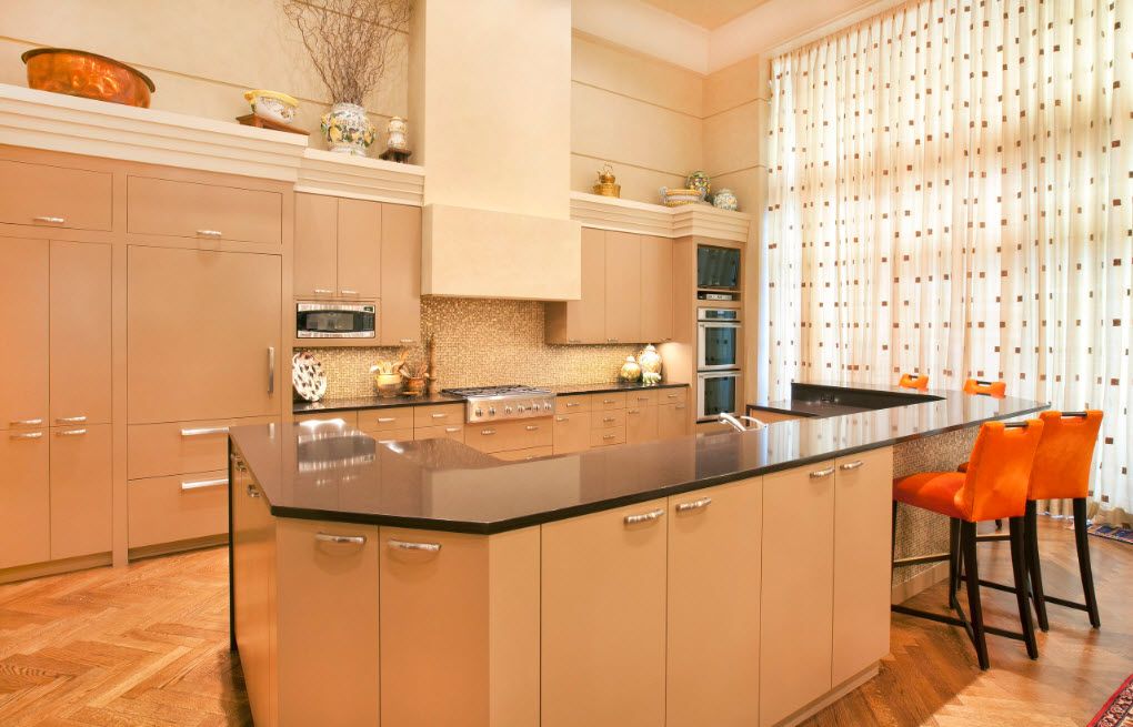 Простой, но беспроигрышный вариант – выбрать тюль один в один под цвет кухонной мебели. Цветовая гамма получится нейтральной, что даст простор для игры с мелкими деталями, которых много на кухне, и аксессуарами.