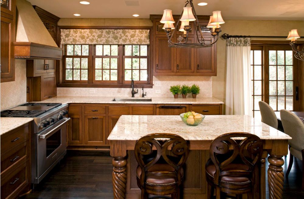 Можно не повторять цвета в точности, но выбирать их в единой цветовой гамме. Правило работает, когда кухонная мебель выполнена под темное дерево. Нет смысла искать в магазинах темный тюль, лучше взять его в растительных оттенках – бежевом, коричневом, зеленом, расцветок осенней листвы и т.п.
