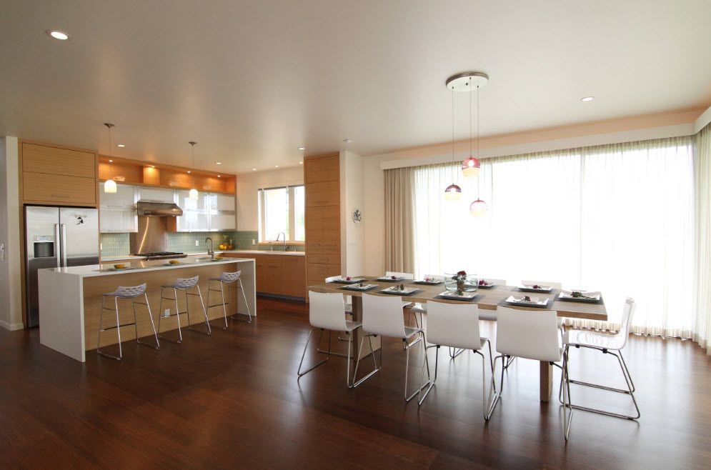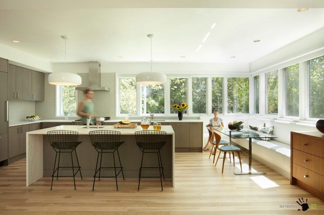 Если в просторном помещении кухни, совмещенной со столовой, используются окна различной модификации, то они нуждаются в индивидуальном подходе к обеспечению драпировкой. Например, окна, расположенные над столешницами нижнего яруса шкафов, можно оформить с помощью тюлевых жалюзи или на манер японских штор-экранов. А для больших панорамных окон или стеклянных дверей можно использовать классический вид полупрозрачных занавесок.
