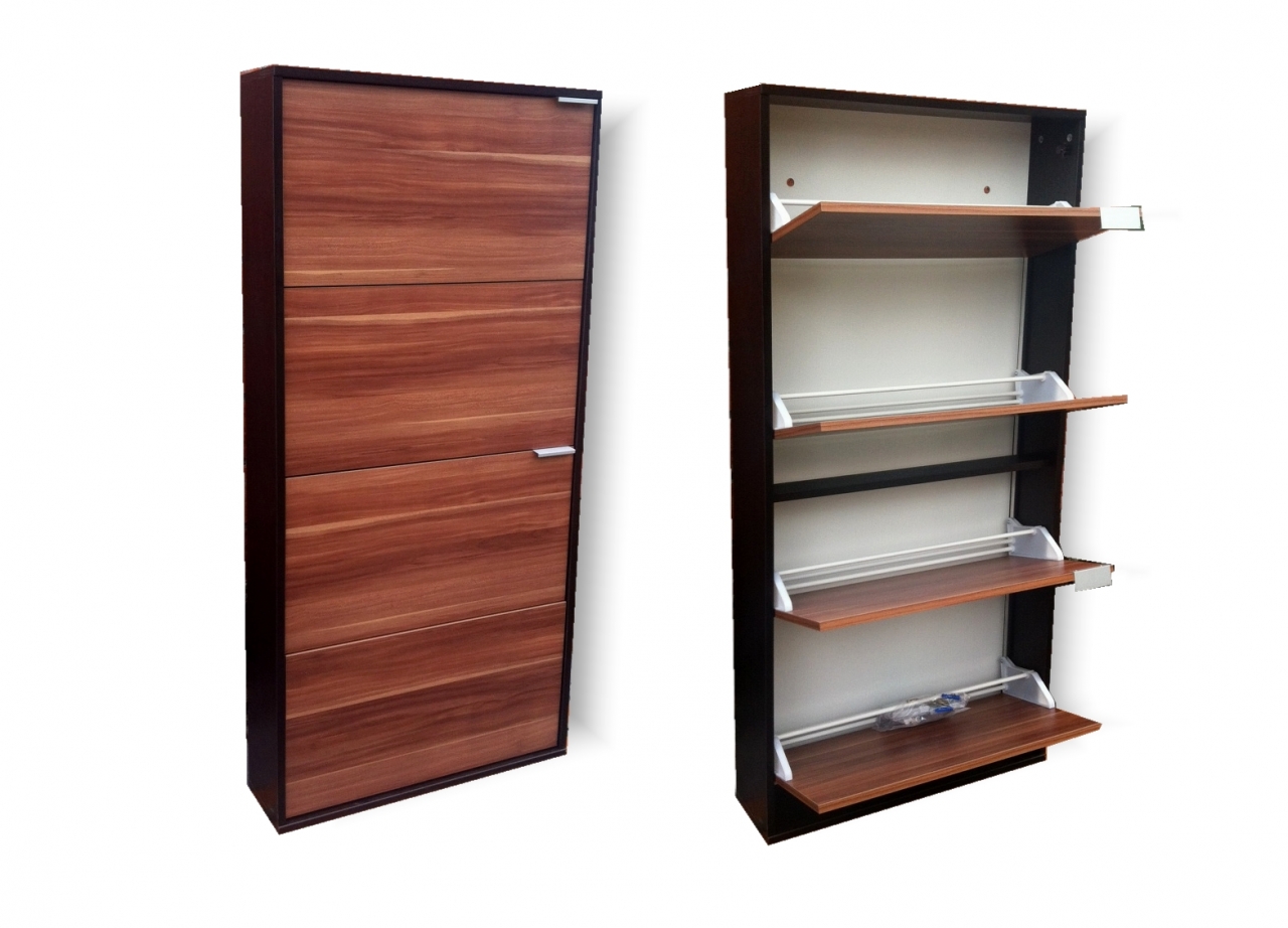 Обувницы подобной формы в последнее время становятся более востребованными. Это узкие вытянутые вверх шкафчики, они не займут много места и отлично впишутся в маленький коридор. Ширина полок при этом не превышает 20 см. Обувница представляет собой узкий ящик с откидными полками, на которых и хранится обувь. Чем меньше угол открывания полки, тем больше остаётся пространства для хранения высокой обуви. Это существенный недостаток таких обувниц — форма обуви, например, сапог с высокими голенищами, теряется.
