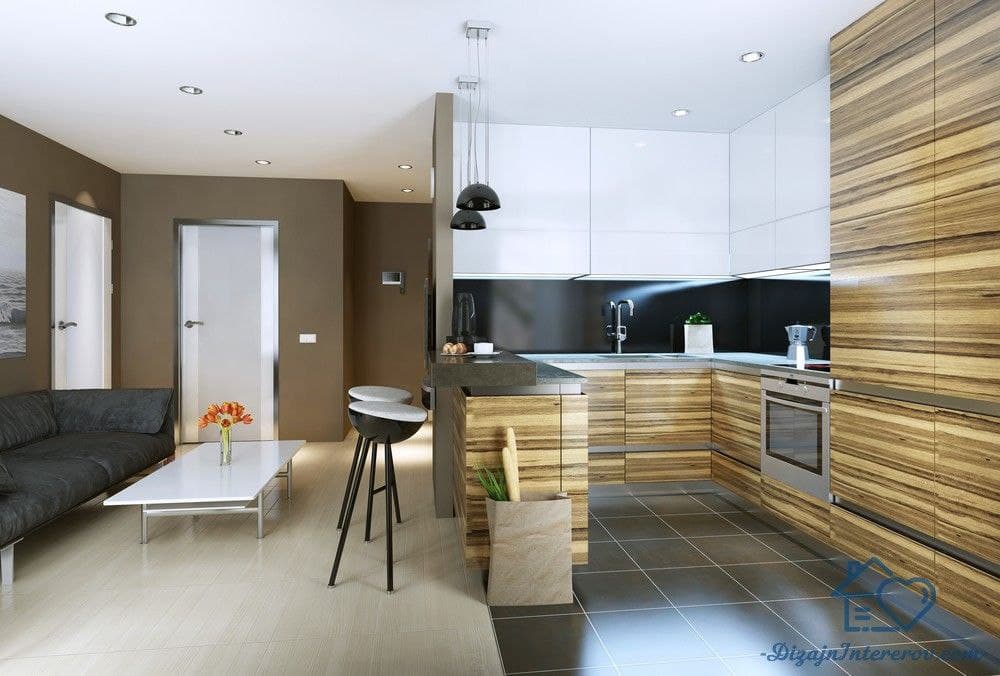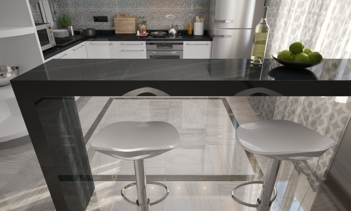 Барная стойка в такой кухне может быть максимально нейтральной, а может, наоборот, привлекать внимание необычным цветом, паттерном или формой. При этом поверхность лучше сделать гладкой и глянцевой, а в качестве материала использовать пластик