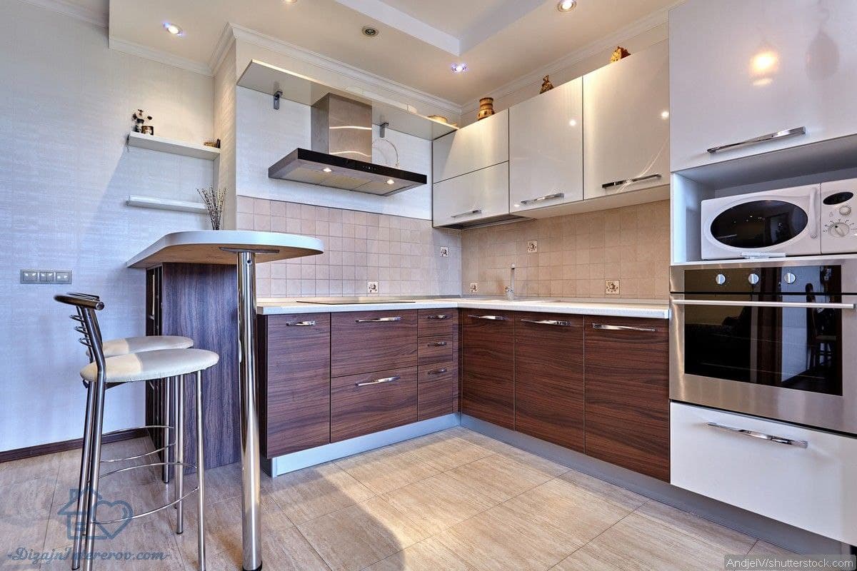 Бежевая палитра так же уместна, как белый цвет. В таких тонах можно выбрать не только гарнитур, но и обои, шторы, столешницу барной стойки, стулья обеденной группы. Этот цвет дополнят бронзовые, медные ручки, позолоченные элементы. Как правило, ремонт не может быть выполнен в одном оттенке, поэтому бежевая гамма нередко дополняется натуральным деревом в более темных тонах. Это может быть деревянная столешница гарнитура с островом или барной стойкой. Обеденные стулья и стол могут быть выполнены из массива или МДФ темных тонов, а их обивка будет бежевой. Коричневая палитра делает такой интерьер более теплым и уютным.