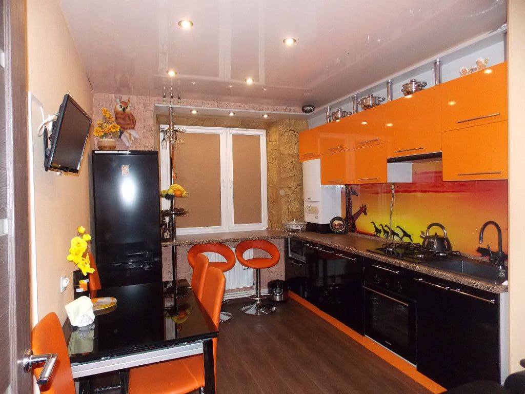 - Одну стенку можно оставить без верхних шкафчиков. На их место вешаем телевизор либо декоративные элементы: картины, фотографии, панно и т.д.