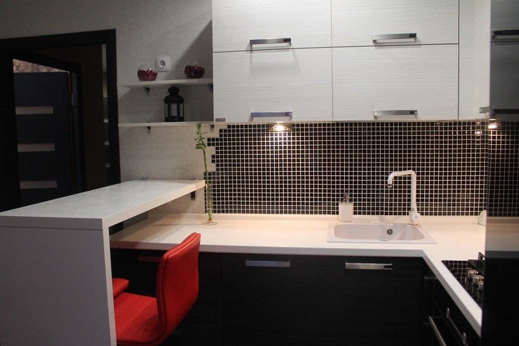 Фартук углового гарнитура устанавливается как из керамической плитки небольшого формата, так и из современных материалов – ламинированной влагостойкой ДСП, МДФ и полимерных композитов. Расцветка должна быть белой, как и столешница: таким образом получается выделить основную задумку темного кухонного помещения.