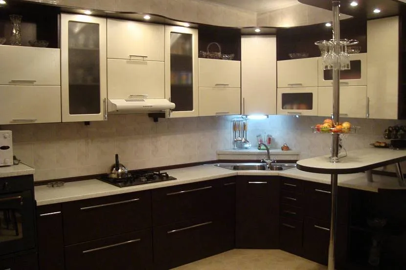 Двухуровневые кухни буквой Г делают в разных стилистических решениях: