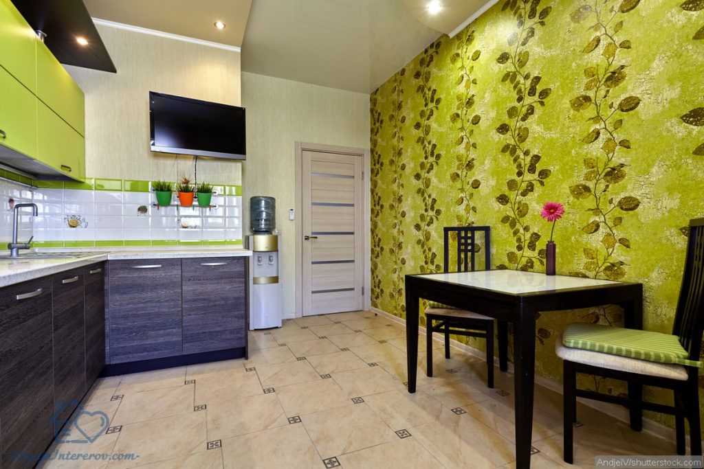 Сочетание зеленого с венге в кухонном интерьере наполняет его свежестью и чистотой. Благодаря такому оформлению помещения жильцы становятся более жизнерадостными, чувствуют прилив сил.