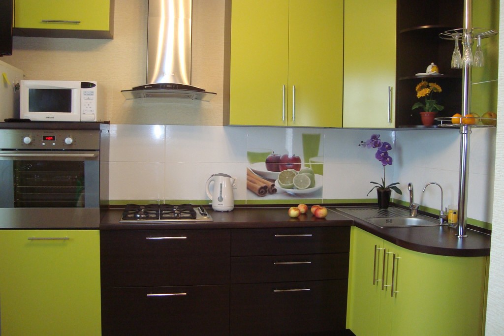 Сочетание с различными оттенками зелени, напоминает природе – коричневая земля с зеленой растительностью. Фасады гарнитура здесь оформляются зеленым, а черно-коричневыми, кофейными будут полы, дверные проемы, столешницы. «Зеленый уголок» создают и в обеденной зоне – его оформляют фотообоями, выполненными в соответствующих тонах.