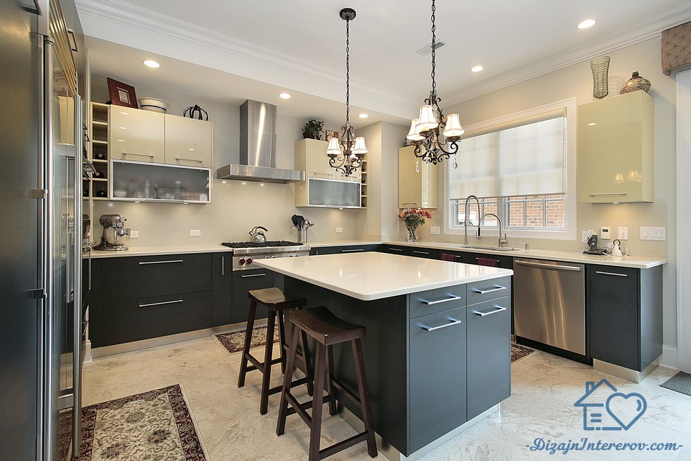 Кухня в белом цвете является классическим вариантом, который вряд ли потеряет свою актуальность. Кто-то может посчитать такой дизайн слишком скучным, непрактичным и, мало того, слишком «стерильным». Именно для того, чтобы разбавить монохромность интерьера дизайнеры рекомендуют использовать темные топы для гарнитура.
