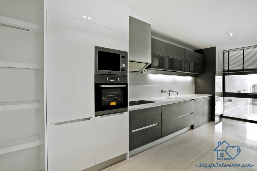 Почти черный венге на матовых поверхностях и белоснежный, холодный глянец – роскошное сочетание для современного дизайна кухни