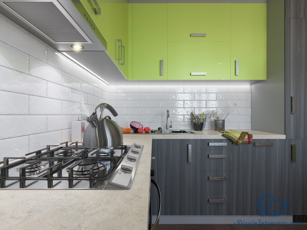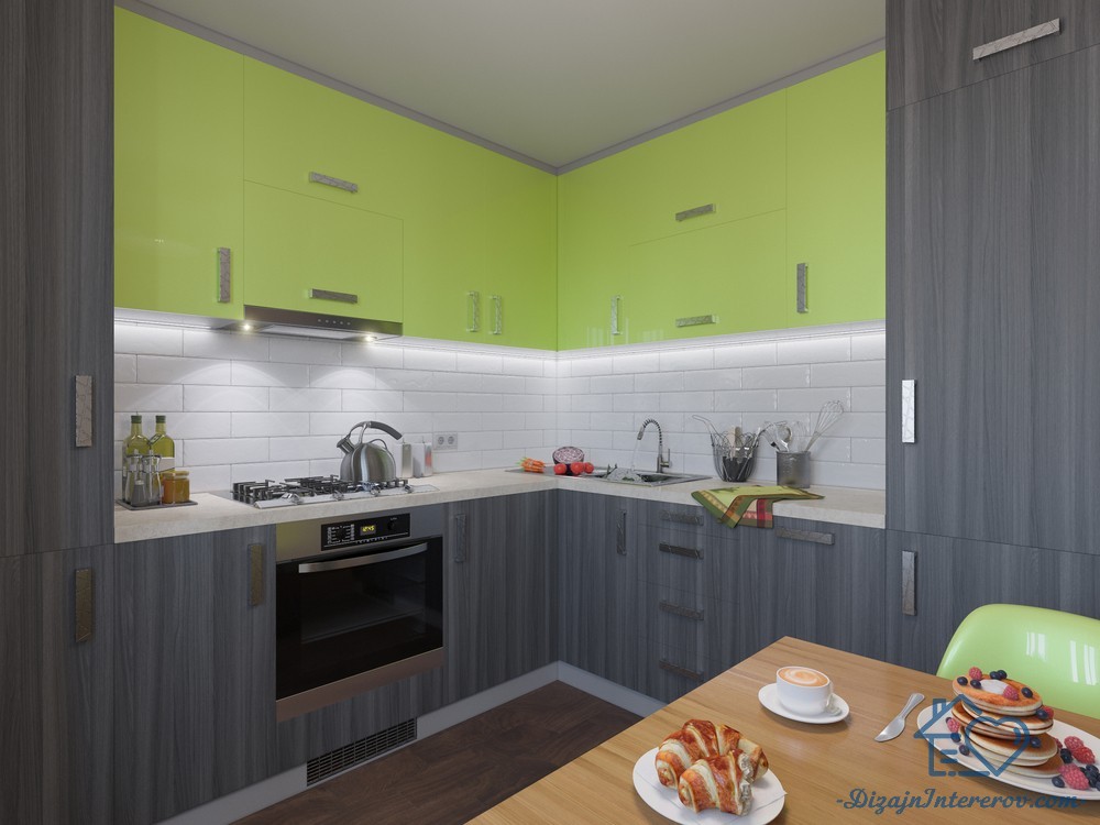 Помимо сочных травянистых оттенков можно подобрать более темные цвета. С серым отлично гармонирует малахитовый, изумрудный и лаймовый. Кухонный фартук можно выложить из крупной плитки или кафеля.