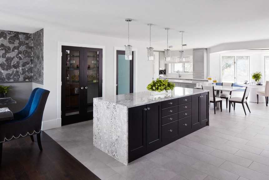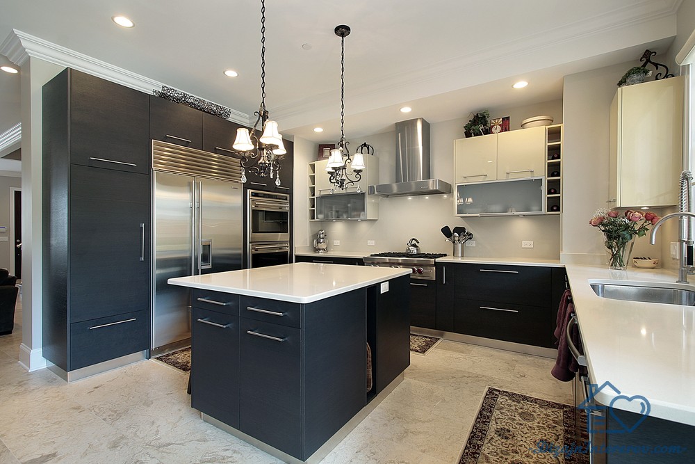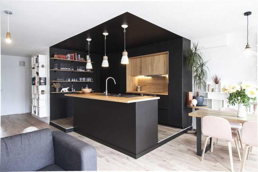 Черный, как и серый – универсальный цвет. Эта комбинация на кухне будет выглядеть необычно, но стильно и брутально. Лучше придерживаться строгих линий и разнофактурных материалов. Такой элемент интерьера будет сочетаться со многими стилями.