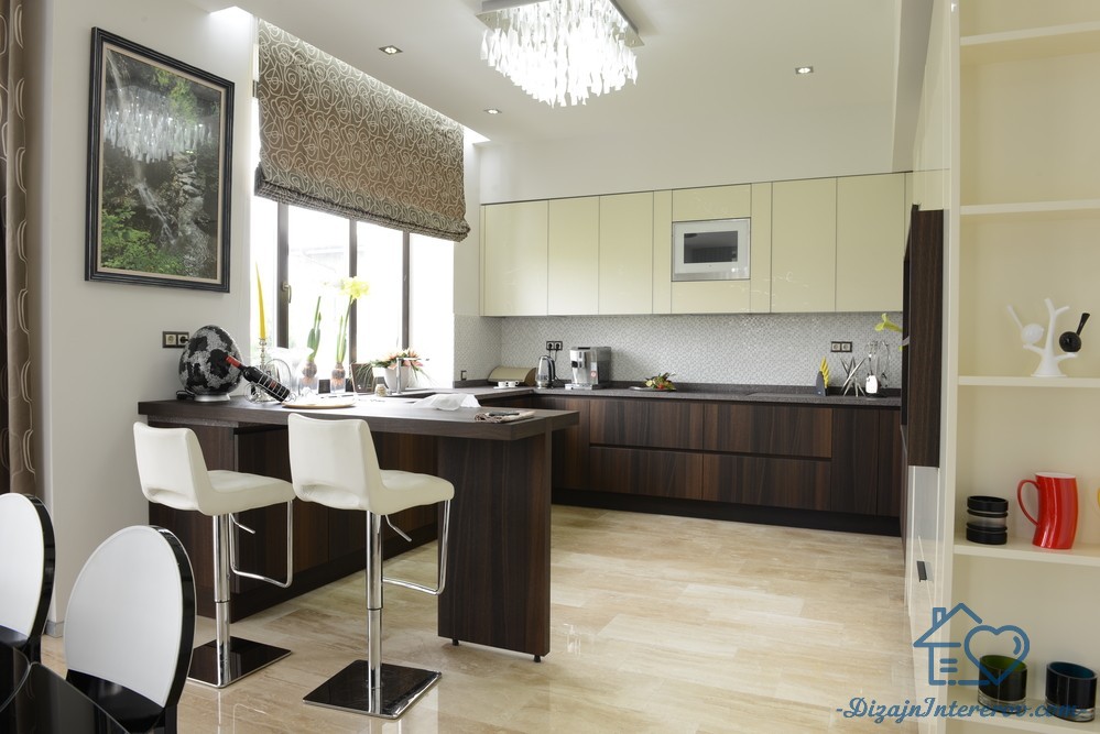 Контрастно выглядит бело-коричневый дизайн кухни, особенно если выбрать насыщенный тон древесины