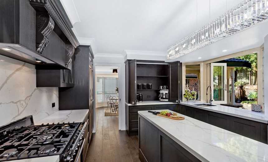 Чтобы подобное оформление выглядело гармоничным, можно использовать темные аксессуары или предметы мебели для наполнения кухни.