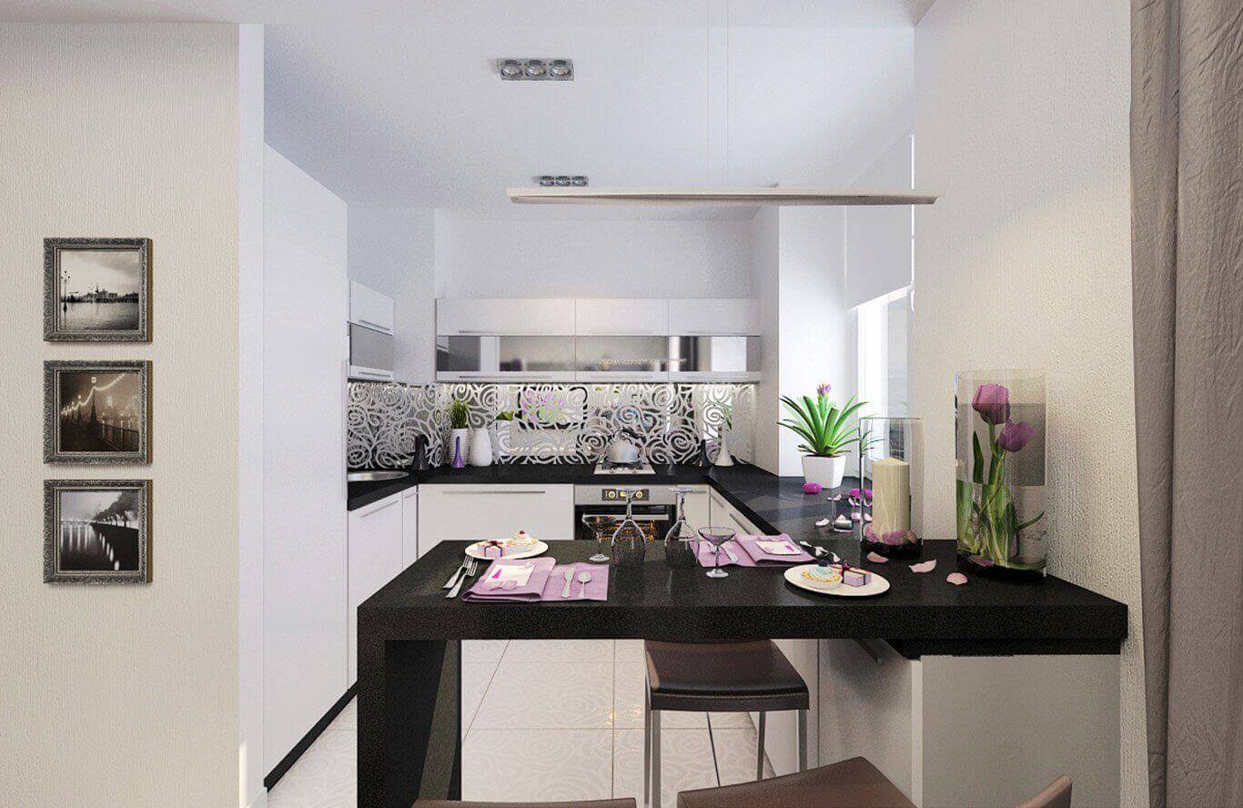 Принцип такой планировки аналогичен угловым гарнитурам с барной стойкой. Только вместо нее часть рабочей поверхности переходит в обеденную зону. Это позволяет сэкономить место и не загромождать кухню отдельным столом.