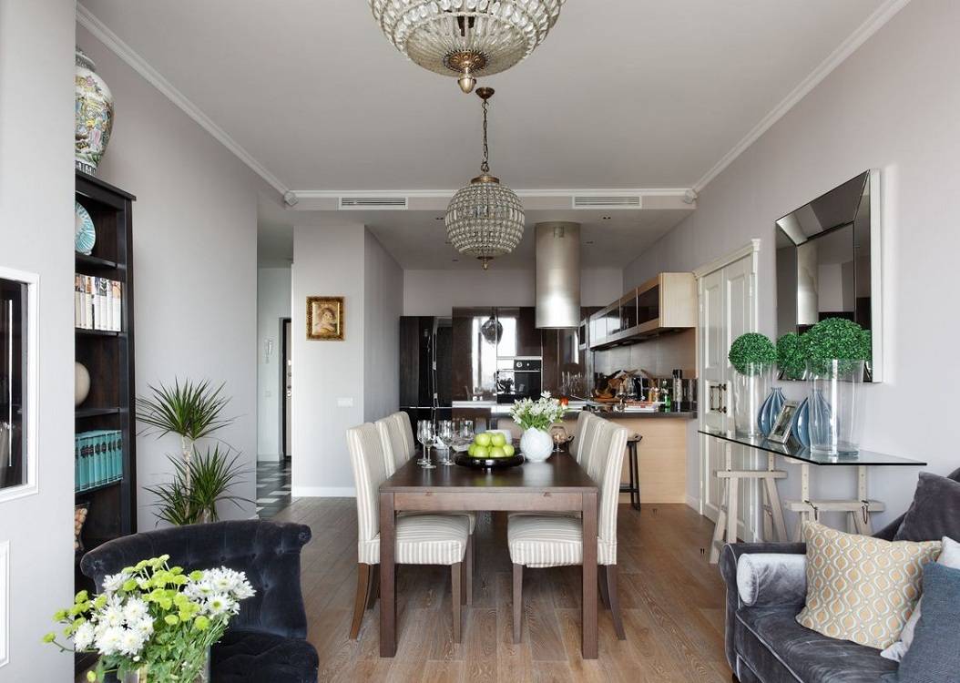 Определив расположение и планировку кухни, стоит заняться проектированием всей комнаты. Остаток пространства можно посвятить только гостиной или же поделить между гостевой и столовой зонами.