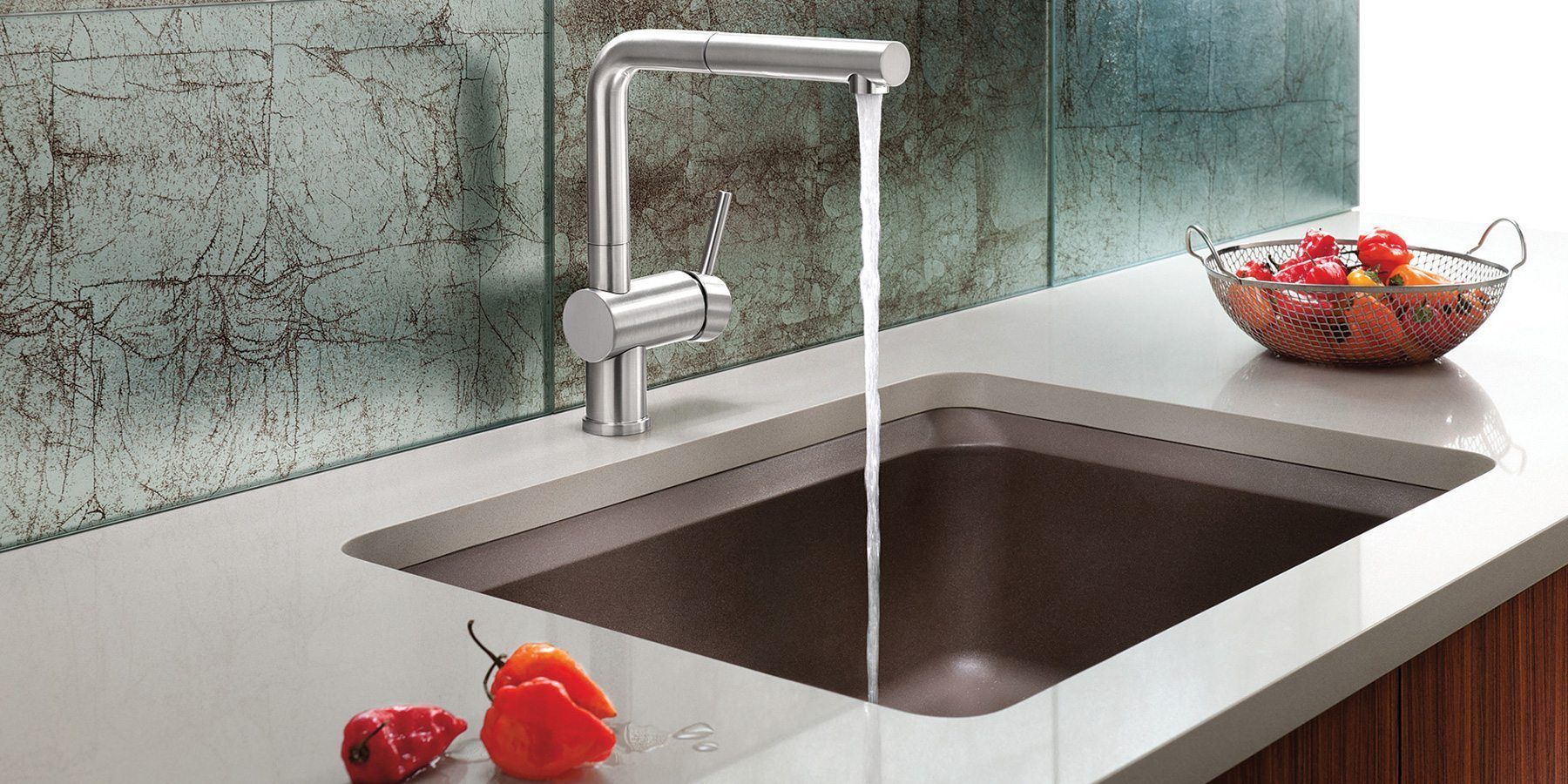 Самый красивый и эффектный (и самый дорогой) способ — мойки, интегрированные в столешницу. По сути, столешница и мойка представляют собой единую конструкцию, как правило, из натурального и искусственного камня или пластика.