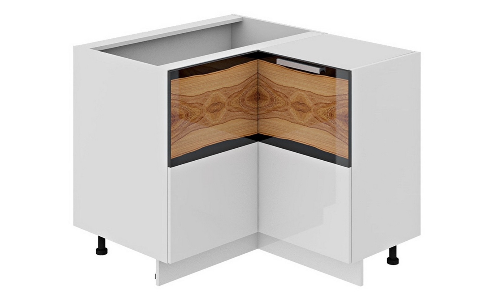 Кухонные тумбы со скошенным углом. Равносторонние размеры (по примыканию к стене) — от 85 см до 90 см. Высота всех видов сегментов варьируется от 85 см до 90 см. Для удобства уборки сегменты комплектуют ножками (до 10 см), которые можно прикрыть мебельной планкой. Она крепится на специальные клипсы. |