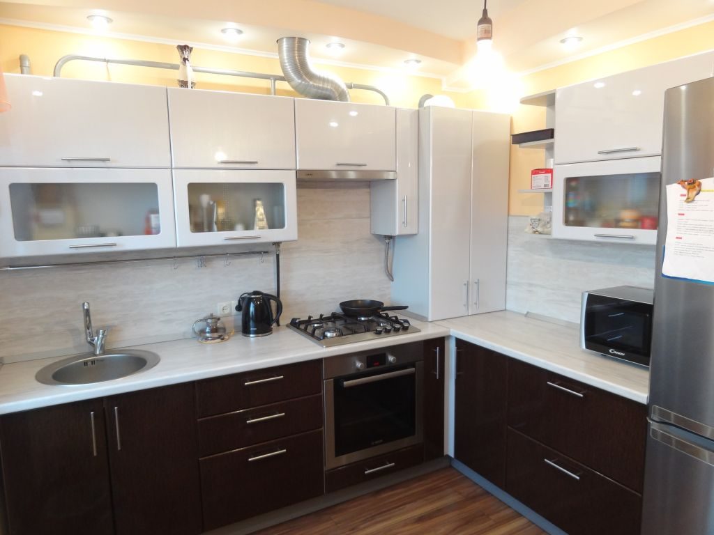 Также глянцевый эффект достигается благодаря пленке ПВХ, которая имеет невысокую стоимость, но со временем отслаивается от гарнитура из-за воды и теряет внешний вид под воздействием солнечных лучей. Глянцевая кухня цвета кофе гармонично смотрится в стиле модерн, хай-тек или японский минимализм.