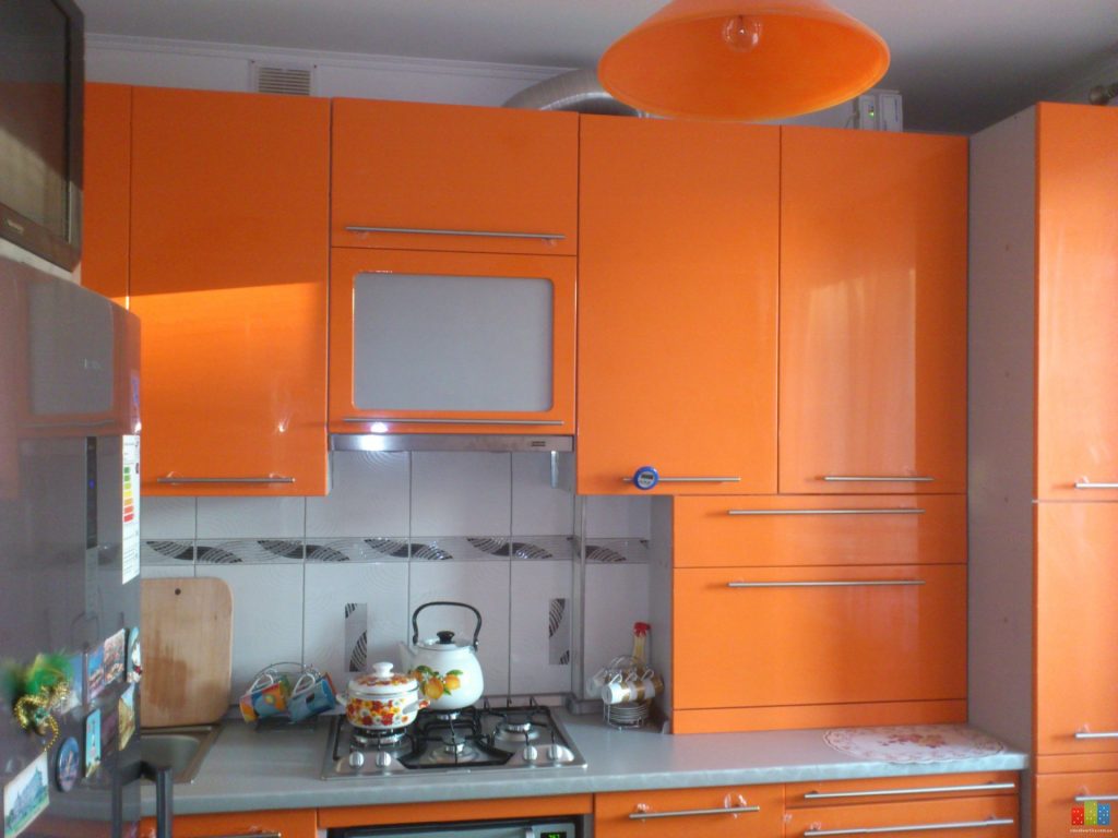 Такой гарнитур идеален для кухонь со средней и малой площадью. Особенно, если мойка расположена в углу, холодильник слева и плита справа от неё.