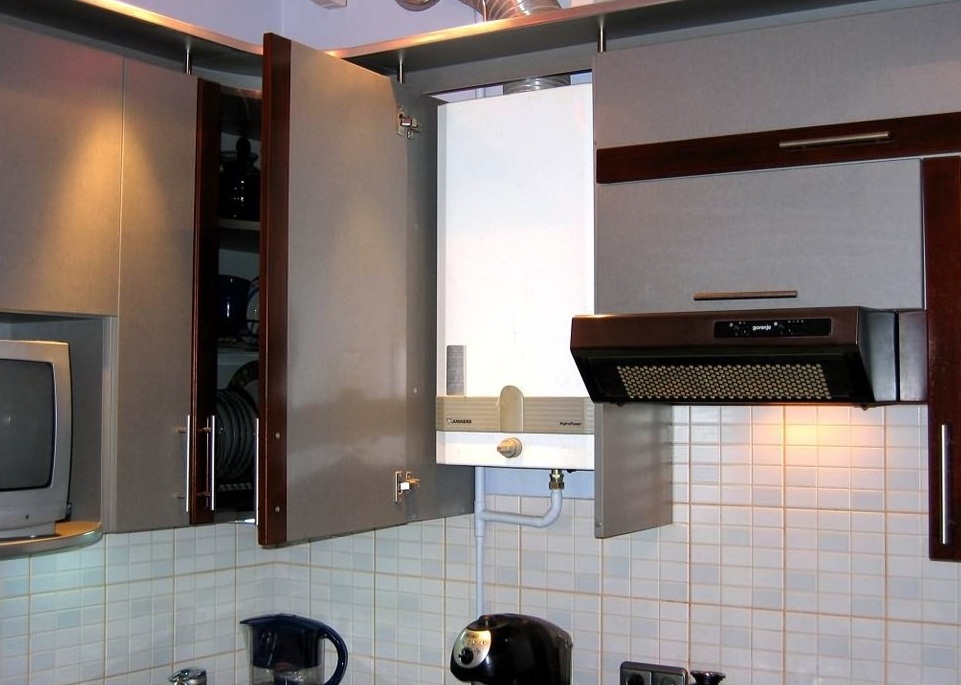 Для этого нужно оборудовать гарнитур легко открывающейся дверцей, и создать отступ поверхности котла от стенок шкафа не менее 3 см. Для пожаробезопасности внутренняя часть шкафа может быть устлана фольгой. Это убережет стенки от возможного перегрева и возгорания.
