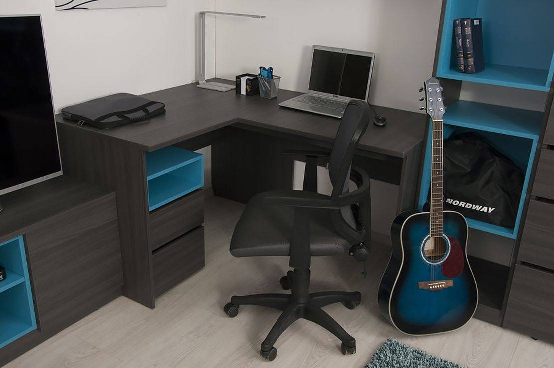 На фото пример черного углового компьютерного стола с голубыми вставками.