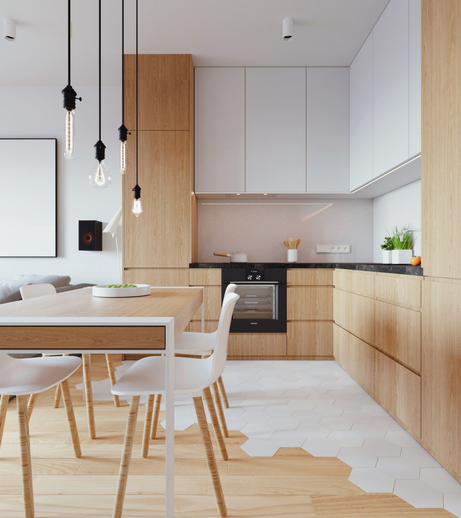 Благодаря комбинированию отделочных материалов, можно отделить гостиную от кухни. Так, в гостиной можно положить на пол ламинат, а на кухне – плитку.