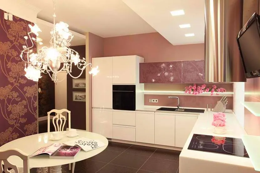 - Учитывать максимальное количество света. Для этого послужат люстра, бра, светодиодные ленты под настенными шкафчиками. Они придадут легкости, невесомости, а глянцевые фасады, отражающие блики, еще больше расширят пространство.
