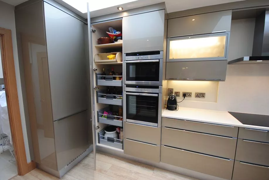 Трендовый интерьер сложно представить без встроенной бытовой техники. Этот вариант наиболее удобный и актуальный. Но при выборе комплекта техники (холодильник, духовка, варочная поверхность с вытяжкой и т. д.) нужно заранее заказать гарнитур под него.