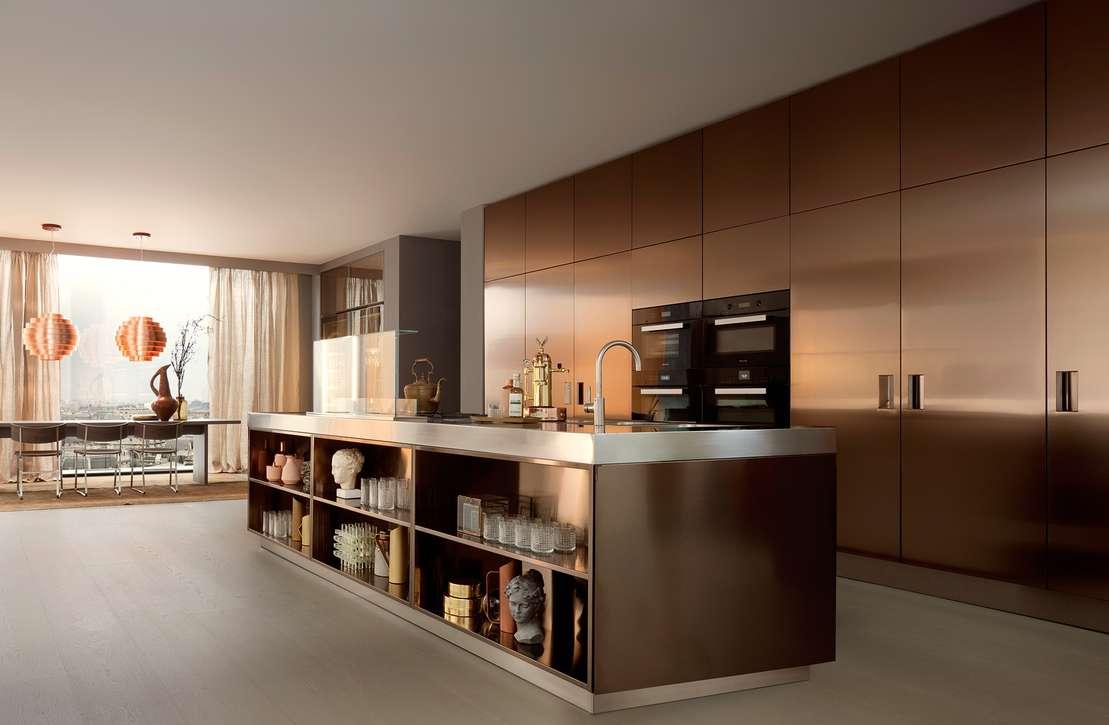 Очень модно в этом сезоне также выглядят кухни с фальшпанелями под металл, которые можно сочетать с блестящей фурнитурой, вытяжкой, холодильником и другой бытовой техники. В моде в 2022 г. и панели под дерево. Такие элементы могут хорошо сочетаться с текстурой фасадов шкафов, полом, отделкой стен.