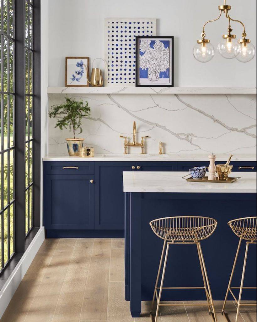 Самым модным цветом в интерьере жилых квартир в 2022 году считается темно-синий. Можно купить для кухни и гарнитур с фасадами такого цвета. Но это решение подойдет исключительно для помещения большого объема. Темно-синий в дизайне углового гарнитура будет модно смотреться в сочетании с белым, голубым, светло-кремовым, серым.
