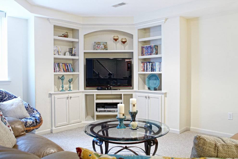 Меблировка гостиной, включающая угловой шкаф — не редкость в современном дизайне. Размещение системы хранения на стыке стен комнаты обладает весомыми преимуществами: