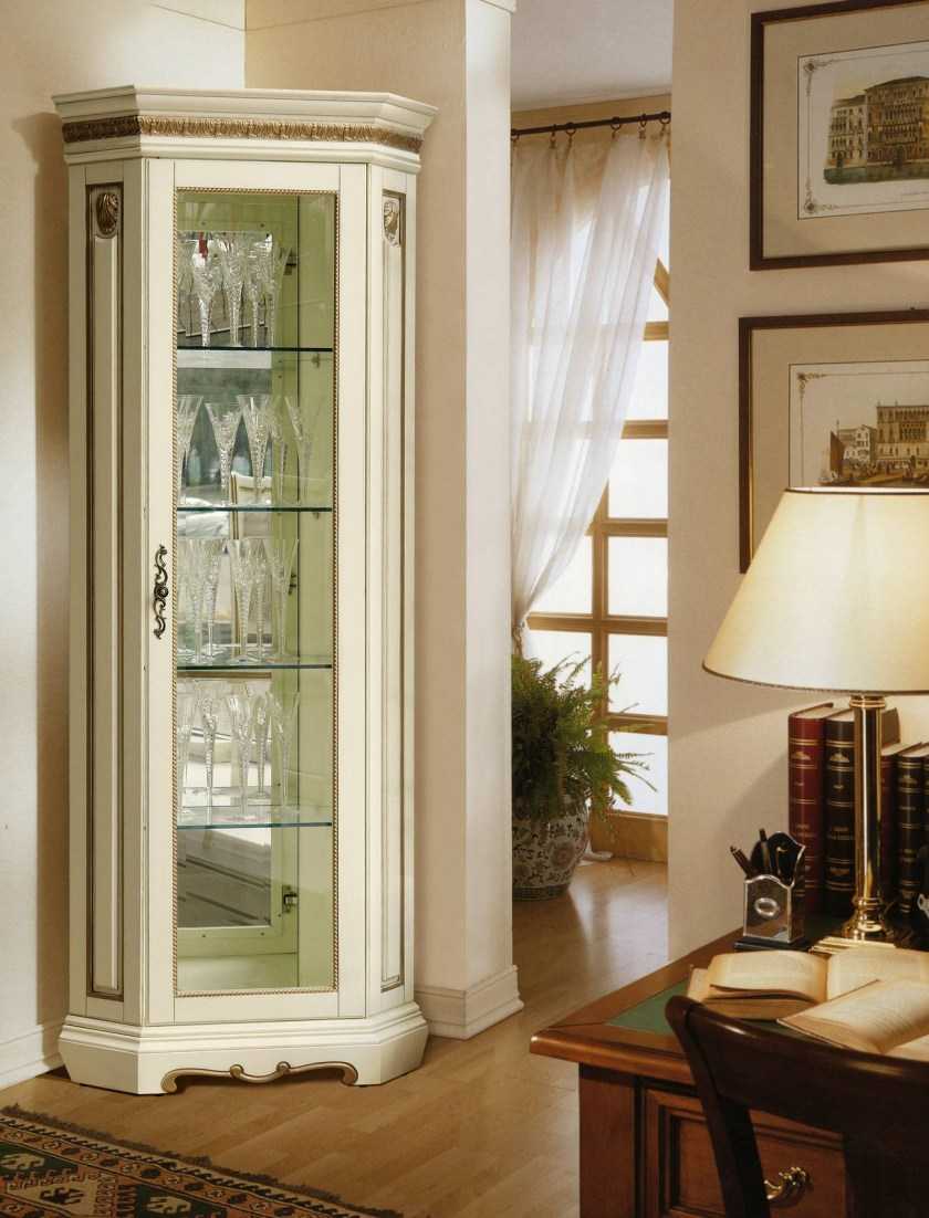 Если интерьер выдержан в классическом исполнении, а целевая аудитория любит демонстрировать аксессуары напоказ, то в углу достаточно устроить традиционный шкаф-витрину. Такая конструкция подходит для хранения вещей лишь при наличии снизу выдвижных ящиков.