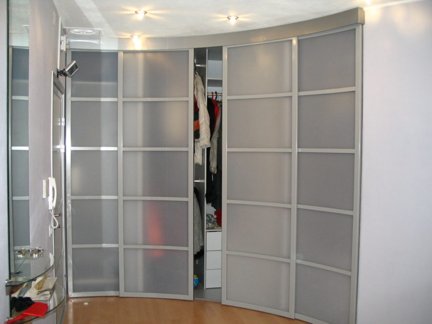 Зеркальный и стеклянный фасад изготавливают из каленого стекла, которые гнут под определенным радиусом. Такая угловая дверь выглядит эффектно, но стоит достаточно дорого. Стеклянные фасады крепятся в алюминиевый профиль, согнутый на специальном оборудовании (вальцах).
